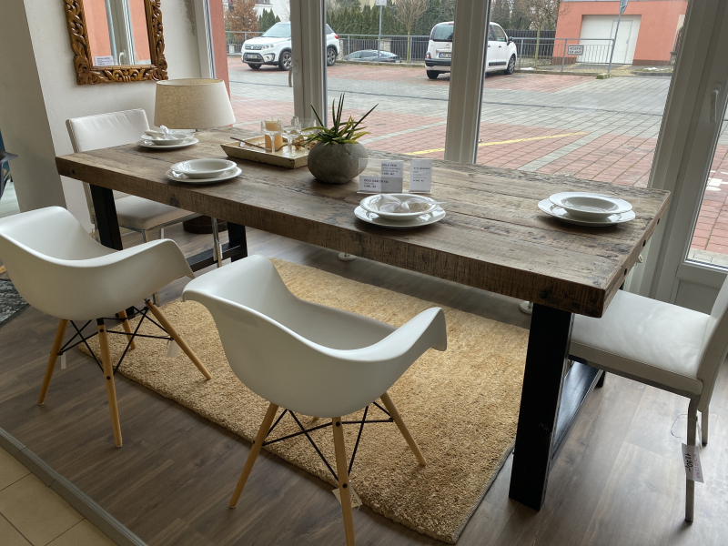 Rustikálny masívny stôl z brestového dreva s kovovou podnožou v čiernej farbe.