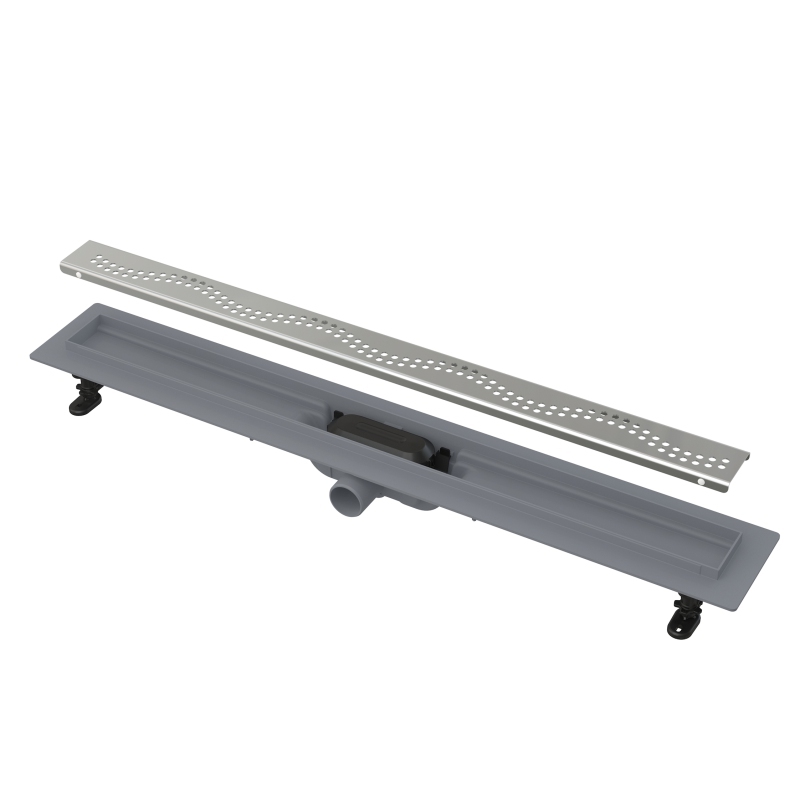 Súčasťou každého žľabu je kompletná súprava žľabu s roštom a výškovo nastaviteľných nôh s kotviacimi prvkami a hydroizolačnou páskou. V ponuke máme tri designové prevedenia roštov.