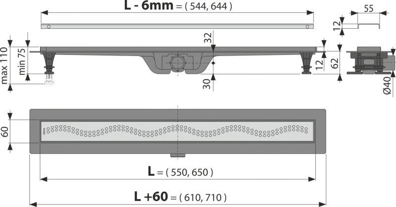 ALCA APZ8-650M Simple - Podlahový žľab s okrajom pre perforovaný rošt