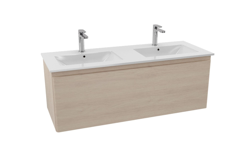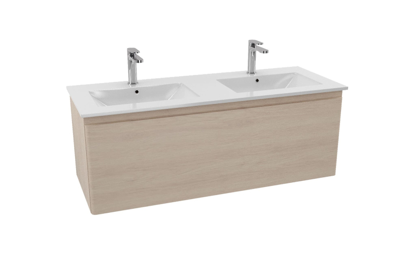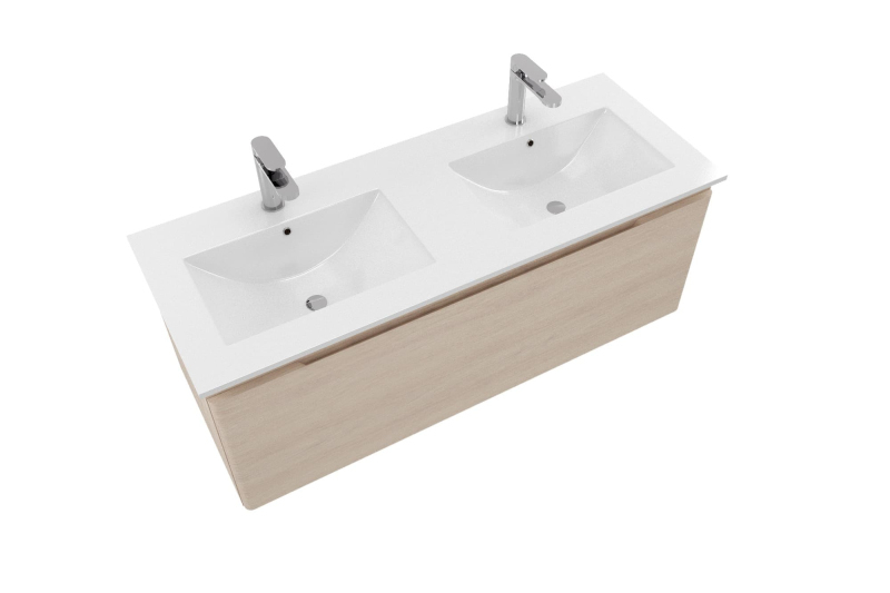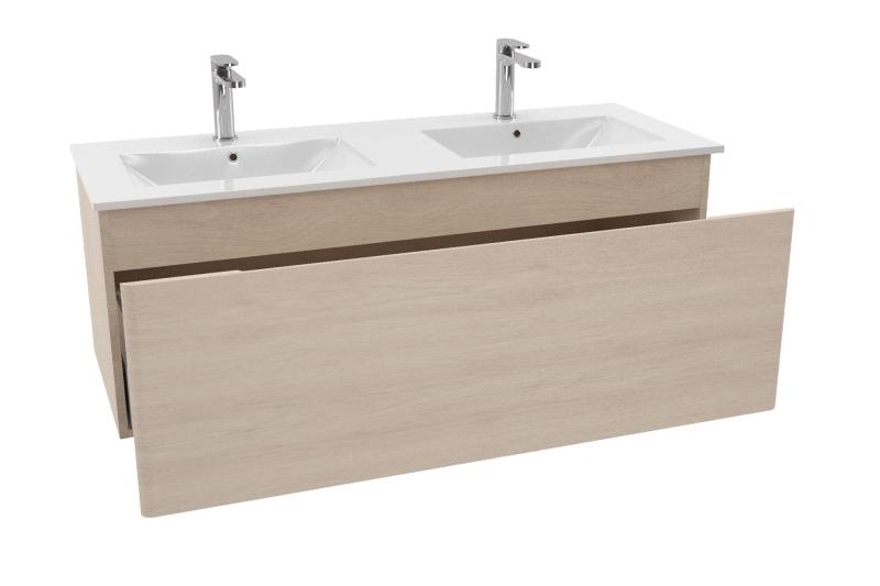 Skrinka s tenkým keramickým dvojumývadlom 120x46 cm. Má jednu veľkú zásuvku s plnovýsuvom, rozdelenú sklenenými prepážkami. Prevedenie je fólia drevodekor akácie. Zásuvka má zafrézovanú úchytku. Súčasťou dodávky je dvojumývadlo. Batériu a sifón je nutné dokúpiť.