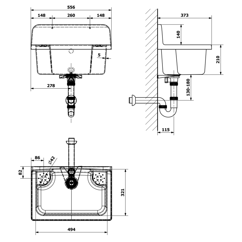 V odkladacie ploche výlevky je príprava na otvor pre batériu, čo umožňuje použitie stojankové drezové batérie. Umiestnenie predpripraveného otvoru je označené na technickom výkrese.