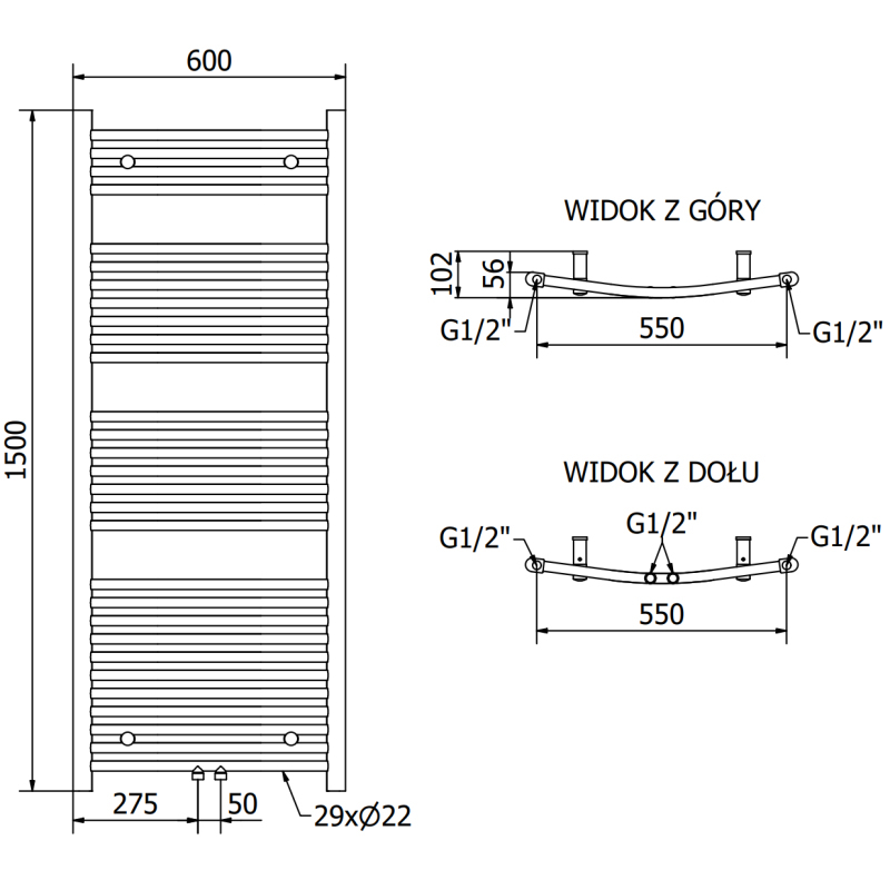 Technické údaje: Výška: 1500 mm Šírka: 600 mm Hĺbka: 56 mm Rozstup pripojenia: - 55 cm (dole) alebo 5 cm (uprostred) Farba: Čierna RAL 9005 Materiál: Oceľ Hmotnosť: 11,26 kg Reakcia na oheň: A0 Prevádzková teplota: 0 max. výkon: - 75/65/20 °C - 733 W Pripojenie: - 2xG ½″ uprostred - 4xG ½″ zhora a zdola na pravej alebo ľavej strane Možnosť inštalácie kúrenia Vysoko kvalitný, odolný, nehrdzavejúci náter Sada obsahuje: zavesenie, montážnu sadu, záslepky