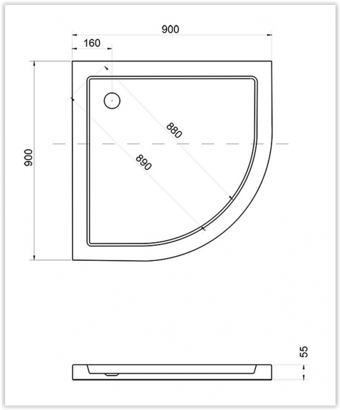- štvrťkruh 900 × 900 × 55 mm, R550