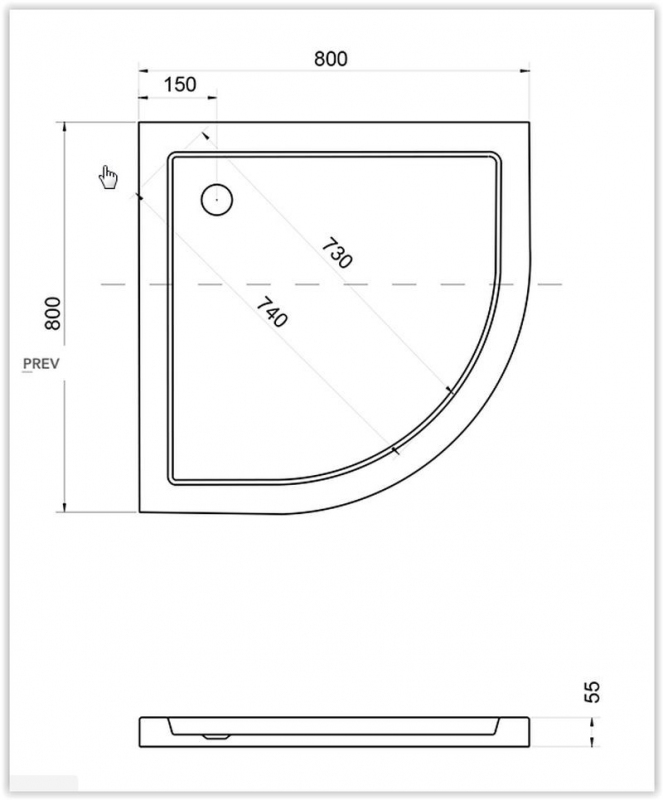 - štvrťkruh 800 × 800 × 55 mm, R550