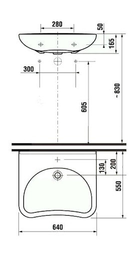 Bezbariérové umývadlo s otvorom pre batériu uprostred so šírkou 64 cm, hĺbkou 55 cm a výškou 16,5 cm. Balenie bez sifónu a batérie. Montážnu sadu je nutné dokúpiť.