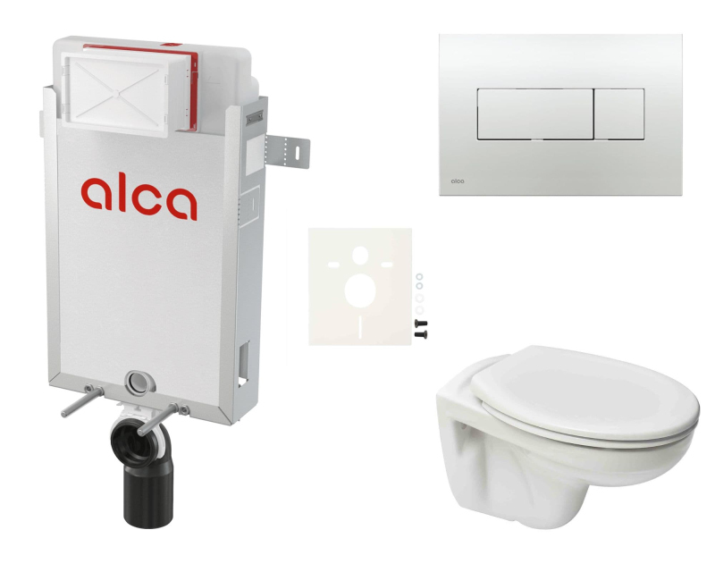 Závesný wc set - sada obsahuje modul na zamurovanie, WC nádržku Alca a WC sedátko. WC doštička je vyrobená z materiálu Duroplast. Ovládacie tlačidlo je z materiálu plast a je vo farebnom prevedení chróm lesklý.