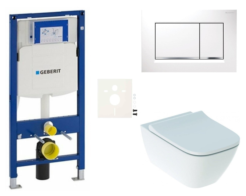 Závesný wc set - sada obsahuje rimfree - bez splachovacieho okruhu. Modul Duofix do ľahkých stien/predstenová, WC nádržku Geberit ovládacie tlačidlo Sigma WC sedátko. WC doska je vyrobená z materiálu duroplast. Ovládacie tlačidlo je z materiálu plast a je vo farebnom prevedení biela.