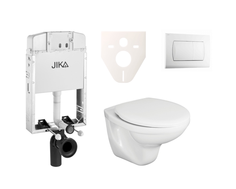 Závesný wc set - sada obsahuje modul na zamurovanie, WC nádržku Jika a WC sedátko. WC doštička je vyrobená z materiálu thermoplast. Ovládacie tlačidlo je z materiálu plast a je vo farebnom prevedení biela.