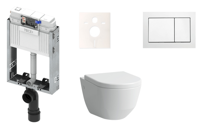 Závesný wc set - sada obsahuje modul na zamurovanie, WC nádržku TECE a WC sedátko. WC doska je vyrobená z materiálu Duroplast. Ovládacie tlačidlo je z materiálu plast a je vo farebnom prevedení biela.