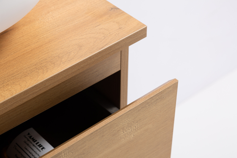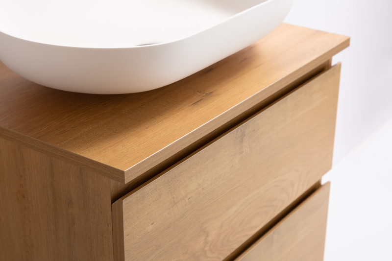 Kúpeľňové skrinky sú vyrobené z MDF lamina (stredne hustá drevovláknitá doska) s nalisovanou melamínovou fóliou, ktorá je odolná voči vlhkosti, poškriabaniu, UV žiareniu a bežným čistiacim prostriedkom. Povrch je hladký, tvrdý, homogénny a ľahko sa čistí. MDF dosky sa nekrútia ako masívne drevo. Pokiaľ dôjde k mechanickému narušeniu laminácie, samotné MDF jadro môže navlhnúť.