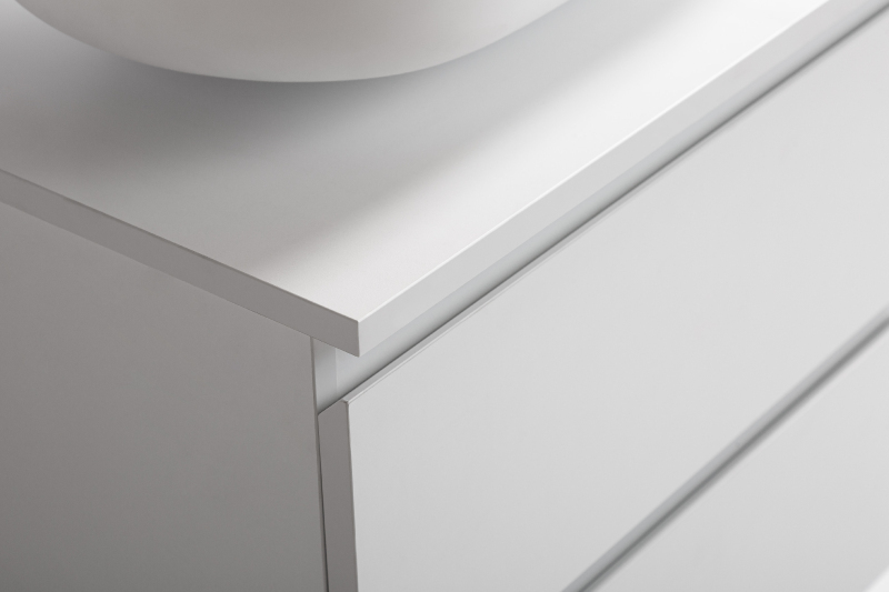 Kúpeľňové skrinky sú vyrobené z MDF lamina (stredne hustá drevovláknitá doska) s nalisovanou melamínovou fóliou, ktorá je odolná voči vlhkosti, poškriabaniu, UV žiareniu a bežným čistiacim prostriedkom. Povrch je hladký, tvrdý, homogénny a ľahko sa čistí. MDF dosky sa nekrútia ako masívne drevo. Pokiaľ dôjde k mechanickému narušeniu laminácie, samotné MDF jadro môže navlhnúť.