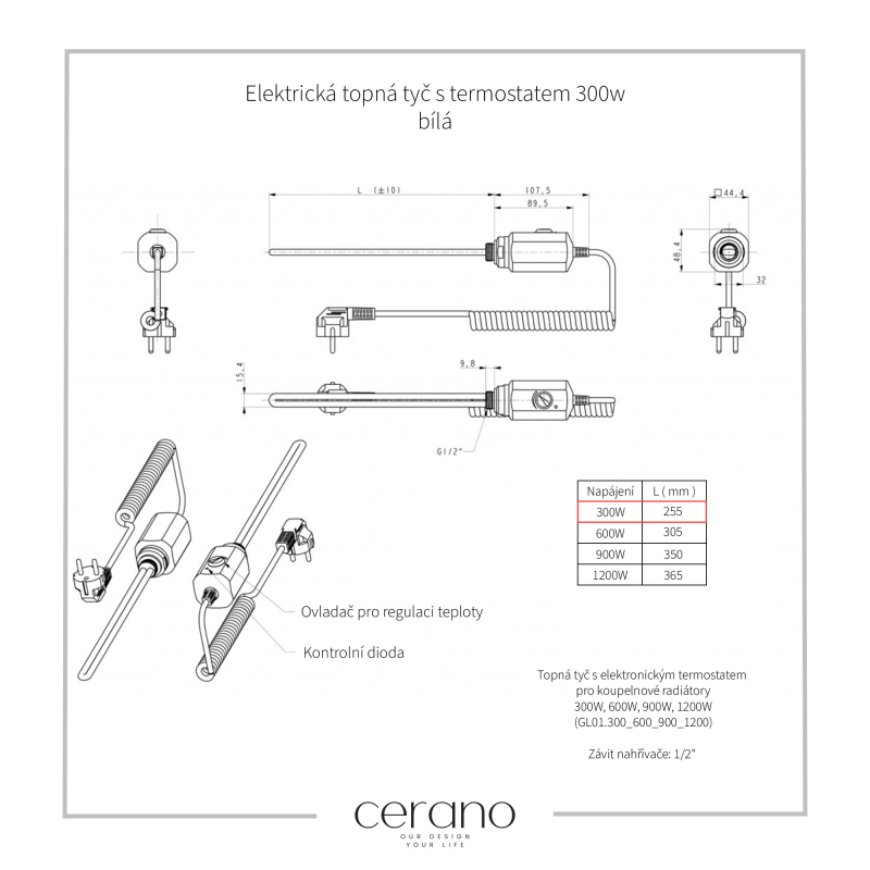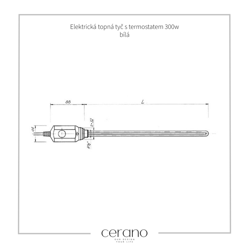 CERANO - Elektrická vykurovacia tyč s termostatom 300W - biela lesklá