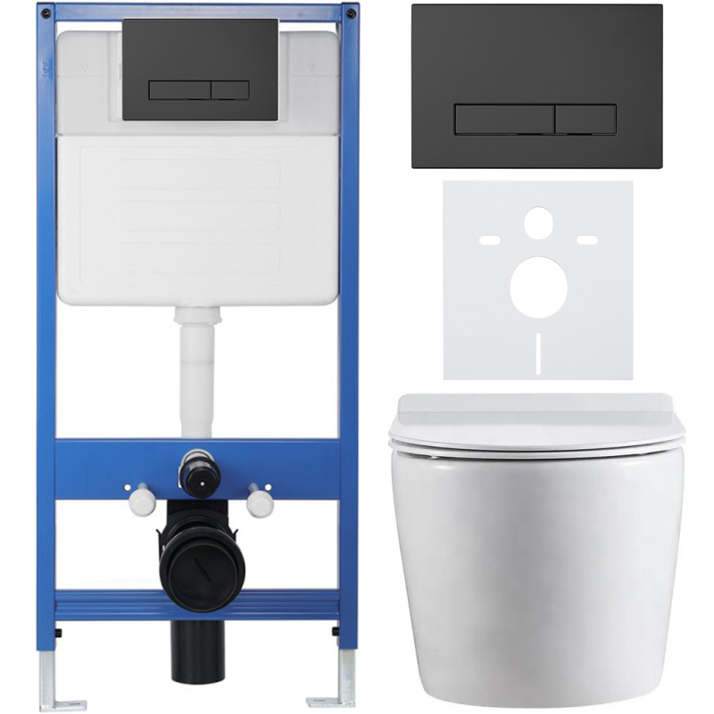 CERANO - Kompletný podomietkový WC set Lite/Felci - biela lesklá - WC tlačidlo Slim, čierne matné - predstenová inštalácia / sadrokartón - 52,5x36 cm