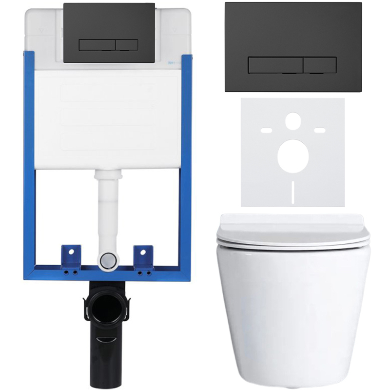 CERANO - Kompletný podomietkový WC set Lite/Norbi - biela lesklá - WC tlačidlo Slim, čierne matné - na zamurovanie - 48,5x36,5 cm