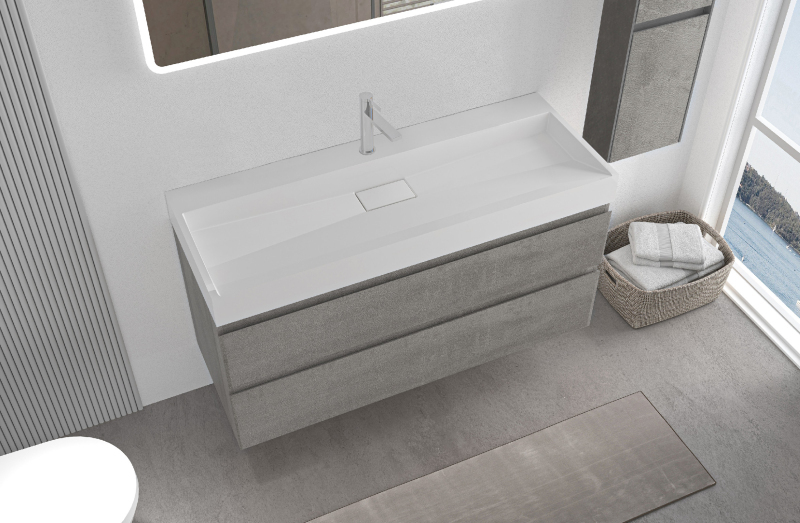 CERANO - Kúpeľňová skrinka Carole - betónovo šedá + umývadlo z lit. mramoru Vita - otvor - biela matná - 100x58x46 cm