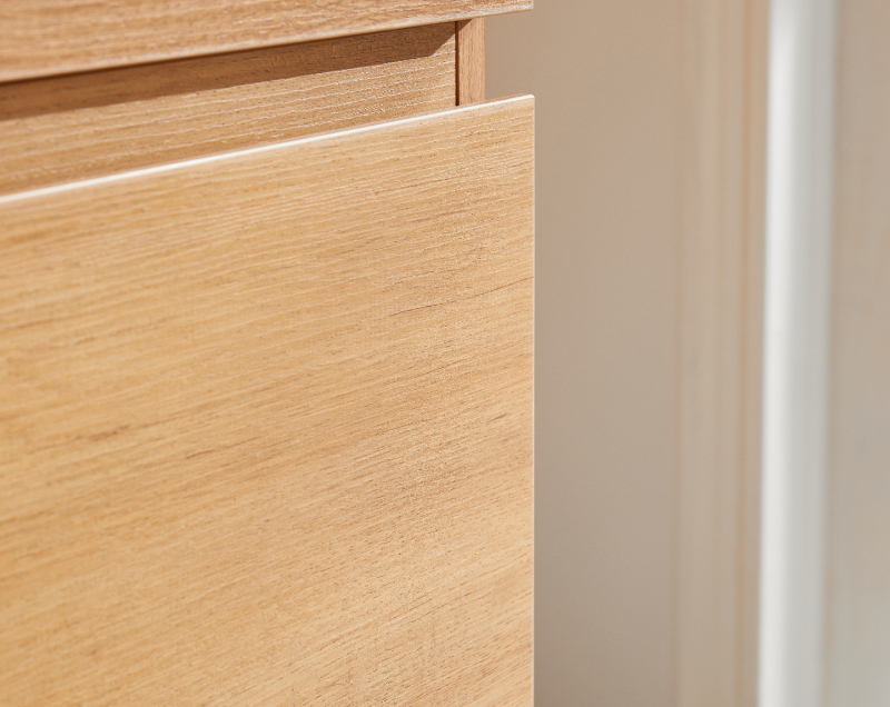 Vďaka integrovanému soft-close mechanizmu sa dvierka a zásuvky zatvárajú plynulo a ticho – hydraulický doraz tlmí náraz, zabraňuje búchaniu a znižuje opotrebenie, takže nábytok vydrží dlhšie a používanie je pohodlné.
