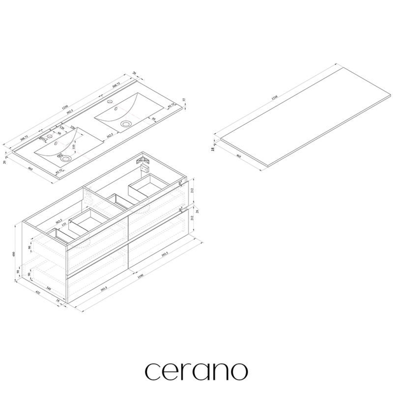 CERANO - Kúpeľňová skrinka Carole s doskou pod umývadlo - 18 mm - betónovo šedá - 121x49,8x46,5 cm