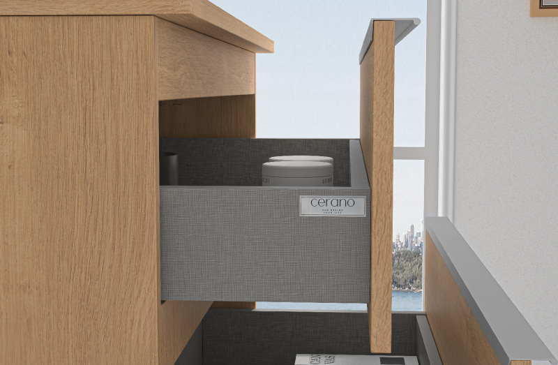 Funkcia tichého dovierania (Quiet Close) zaisťuje, že sa zásuvky zatvárajú hladko a bez hluku. Tento mechanizmus minimalizuje opotrebenie nábytku a prispieva k dlhodobej životnosti skrinky. Umožňuje tiché a pohodlné používanie, čo oceníte najmä v ranných a nočných hodinách.