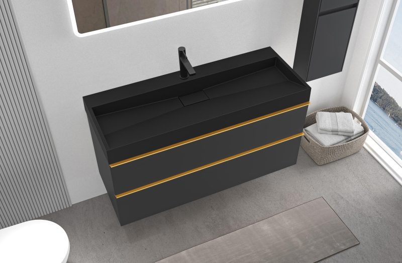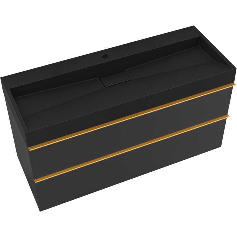 CERANO - Kúpeľňová skrinka Velora - čierna matná - úchytka zlatá + umývadlo s otvorom pre batériu z liateho mramoru Vita - čierna - 100x53x46 cm