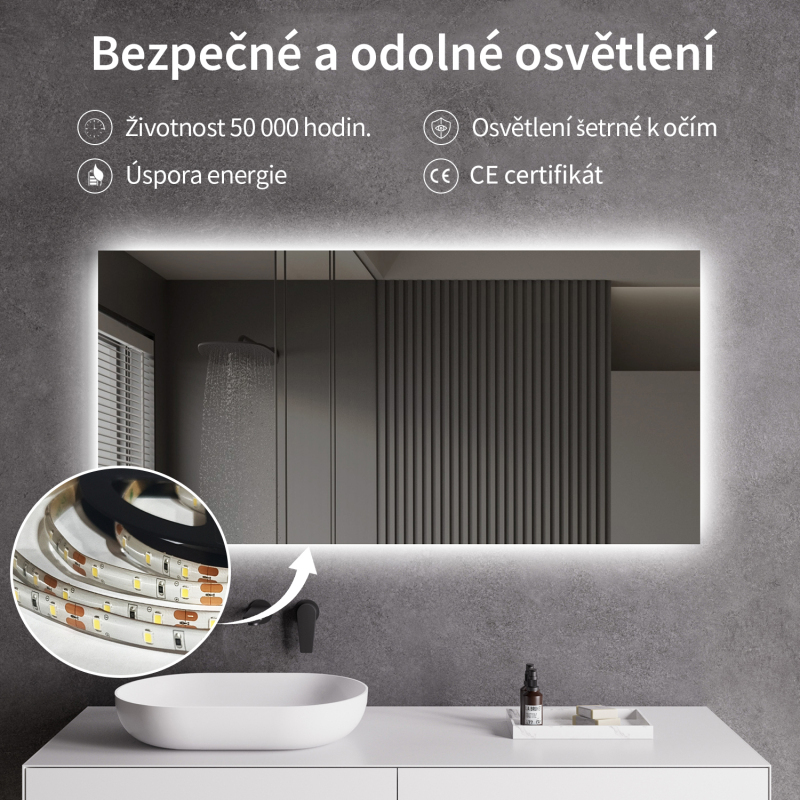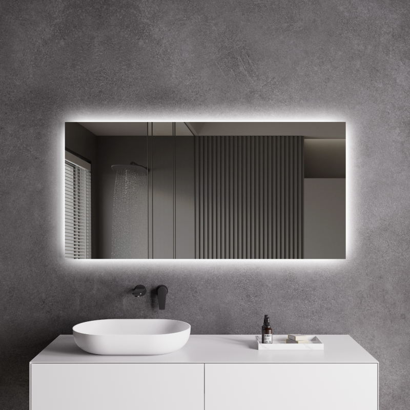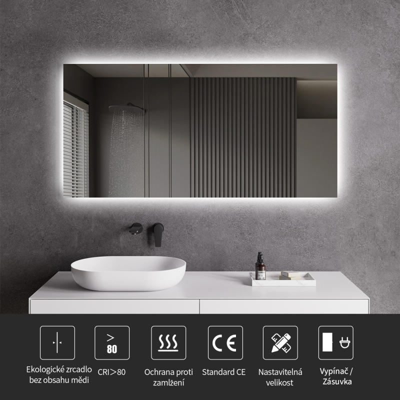 Zrkadlo je vybavené zadným LED podsvietením, ktoré svieti smerom k stene a vytvára jemný svetelný efekt po celom obvode. Rozptýlené svetlo je vyžarované z priestoru medzi rámom a zrkadlom, neoslňuje, zaisťuje rovnomerné a príjemné nasvetlenie priestoru kúpeľne.