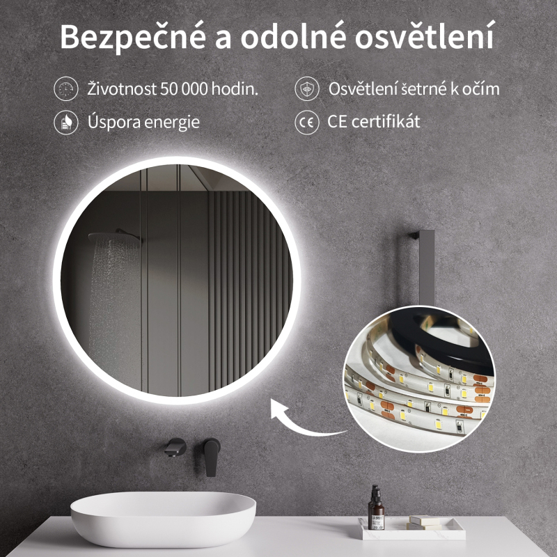 Zrkadlo je vybavené LED osvetlením v studenej farbe - 4000K. Poskytuje intenzívne a jasné osvetlenie, ktoré umožňuje vidieť aj tie najmenšie detaily. Ideálne pre každodennú starostlivosť o pleť.