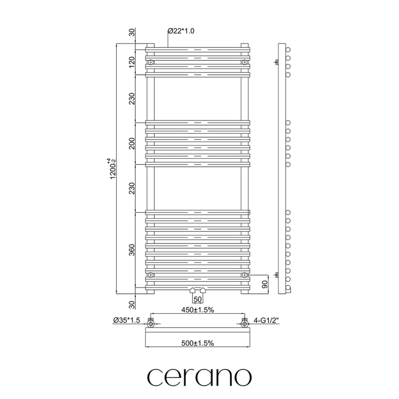 Štandardné pripojenie radiátora je 1/2", čo zaisťuje kompatibilitu s ventilmi a prípojnými sadami Cerano, aj od iných výrobcov. Uistite sa, že všetky súčasti zodpovedajú tomuto priemeru, aby bola zaistená bezpečná a efektívna prevádzka.