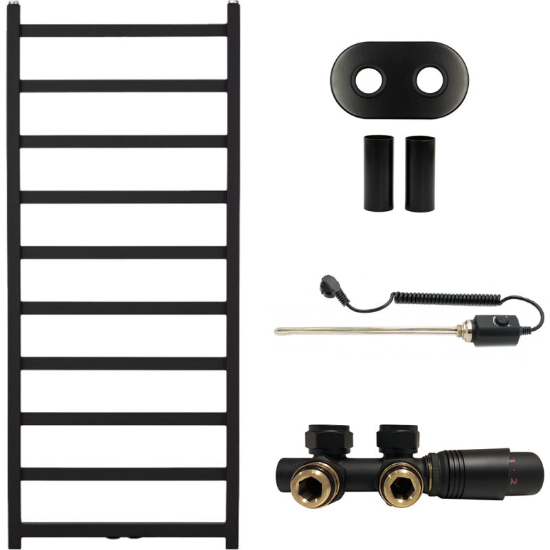 CERANO - Kúpeľňový radiátorový set Pyrodes - kombinované vykurovanie, termo tyč - stredové pripojenie 50 mm - 647W - čierna matná - 1250x530 mm