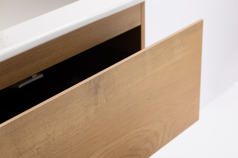 Kúpeľňové skrinky sú vyrobené z MDF lamina (stredne hustá drevovláknitá doska) s nalisovanou melamínovou fóliou, ktorá je odolná voči vlhkosti, poškriabaniu, UV žiareniu a bežným čistiacim prostriedkom. Povrch je hladký, tvrdý, homogénny a ľahko sa čistí. MDF dosky sa nekrútia ako masívne drevo. Pokiaľ dôjde k mechanickému narušeniu laminácie, samotné MDF jadro môže navlhnúť.