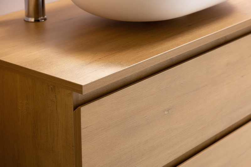 Kúpeľňové skrinky sú vyrobené z MDF lamina (stredne hustá drevovláknitá doska) s nalisovanou melamínovou fóliou, ktorá je odolná voči vlhkosti, poškriabaniu, UV žiareniu a bežným čistiacim prostriedkom. Povrch je hladký, tvrdý, homogénny a ľahko sa čistí. MDF dosky sa nekrútia ako masívne drevo. Pokiaľ dôjde k mechanickému narušeniu laminácie, samotné MDF jadro môže navlhnúť.