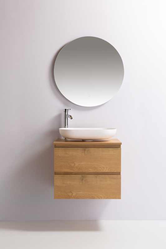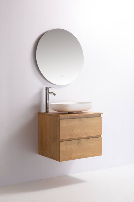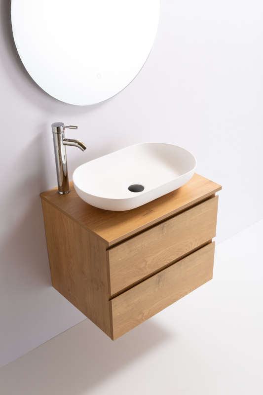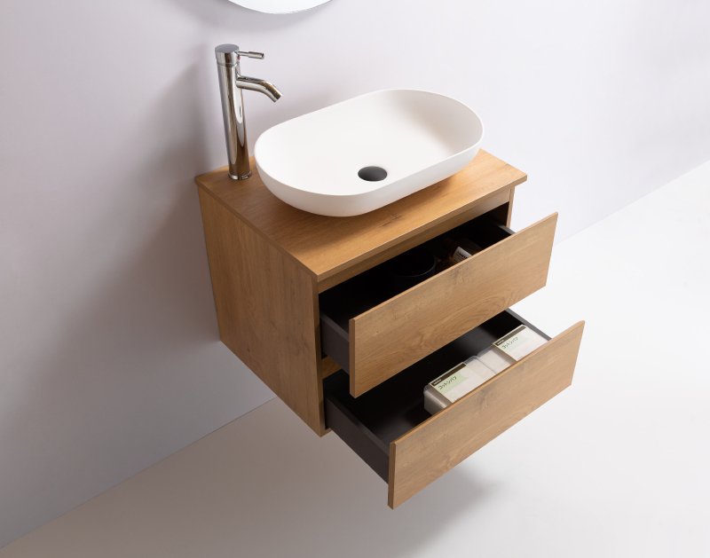 Kúpeľňové skrinky sú vyrobené z MDF lamina (stredne hustá drevovláknitá doska) s nalisovanou melamínovou fóliou, ktorá je odolná voči vlhkosti, poškriabaniu, UV žiareniu a bežným čistiacim prostriedkom. Povrch je hladký, tvrdý, homogénny a ľahko sa čistí. MDF dosky sa nekrútia ako masívne drevo. Pokiaľ dôjde k mechanickému narušeniu laminácie, samotné MDF jadro môže navlhnúť.