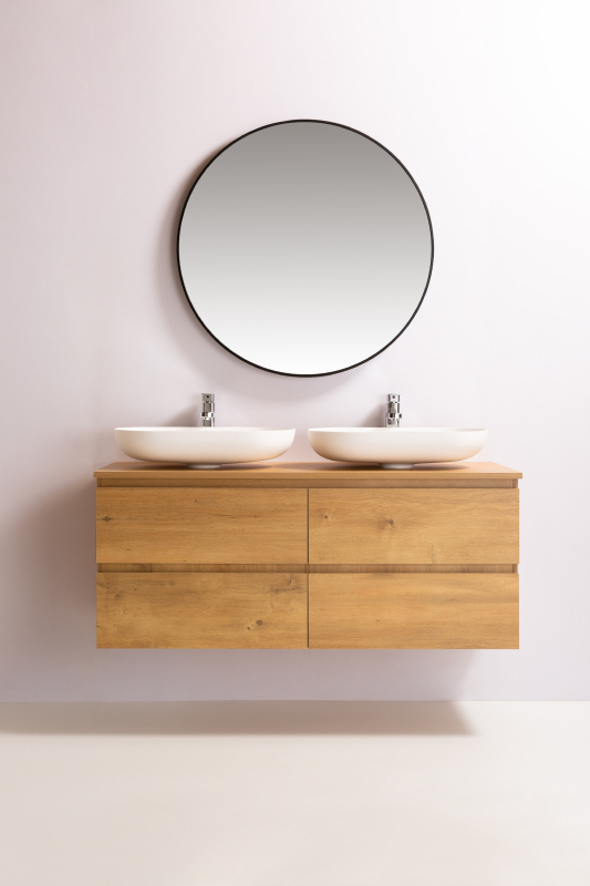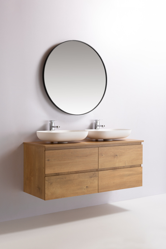 Kúpeľňové skrinky sú vyrobené z MDF lamina (stredne hustá drevovláknitá doska) s nalisovanou melamínovou fóliou, ktorá je odolná voči vlhkosti, poškriabaniu, UV žiareniu a bežným čistiacim prostriedkom. Povrch je hladký, tvrdý, homogénny a ľahko sa čistí. MDF dosky sa nekrútia ako masívne drevo. Pokiaľ dôjde k mechanickému narušeniu laminácie, samotné MDF jadro môže navlhnúť.