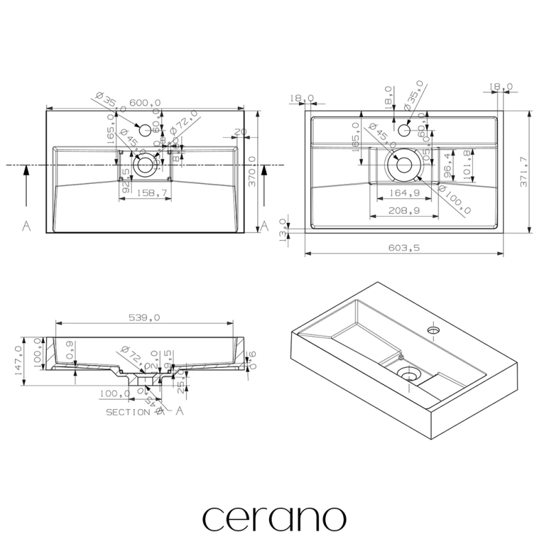 CERANO - Umývadlo z liateho mramoru Vita - nástenné aj na dosku - otvor pre batériu - biela lesklá - 60x37 cm