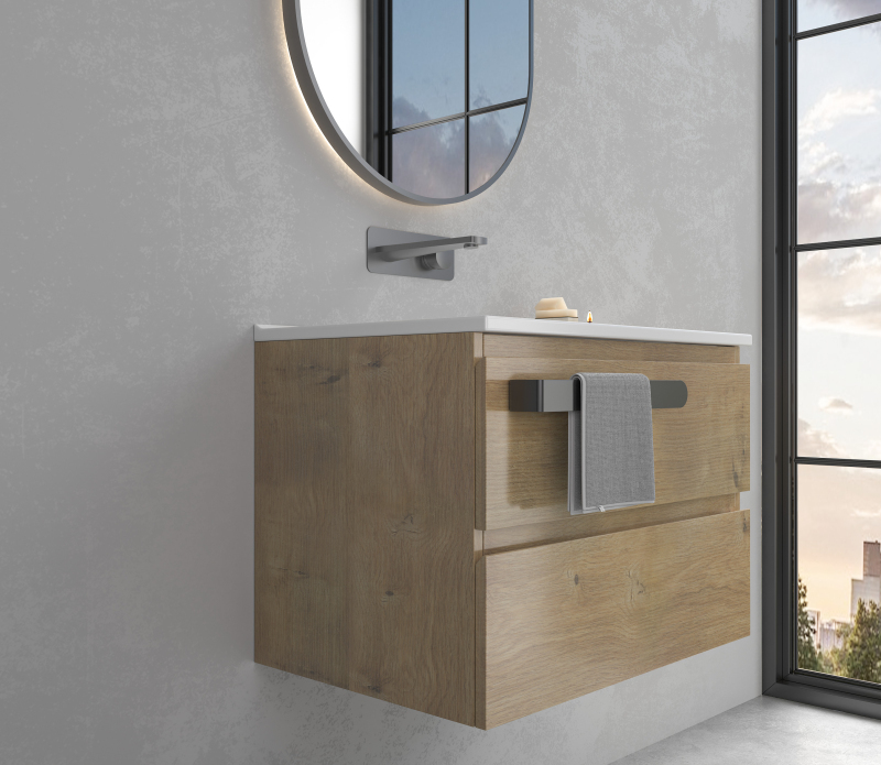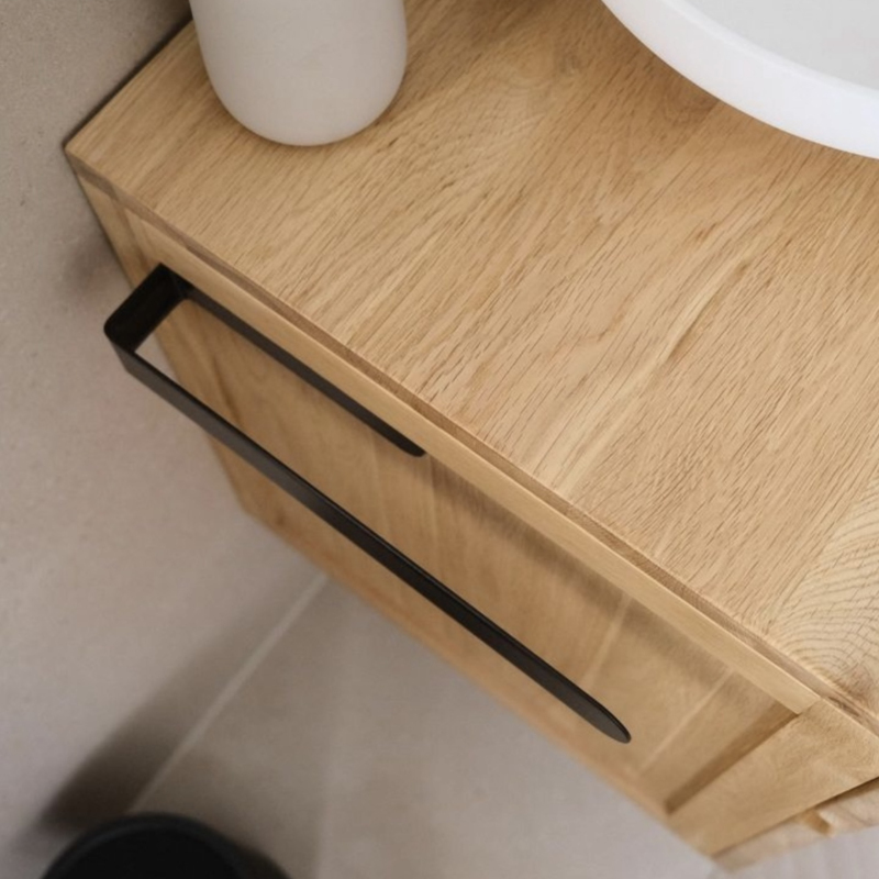Predná strana disponuje dlhým ramenom, ktoré slúži na umiestnenie uterákov. Toto rameno je pevne upevnené k stene pomocou obojstranne lepiacej vložky, ktorá je diskrétne umiestnená na zadnej strane kratšieho ramena. Jej dokonalá priľnavosť k povrchu steny zaručuje, že držiak bude maximálne stabilný a unesie aj ťažšie tkaniny. Montážne komponenty sú súčasťou balenia.