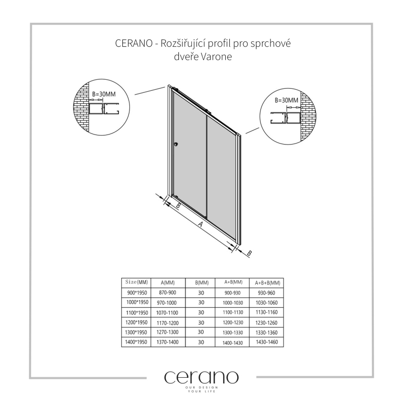 Tento rozširujúci profil značky Cerano je navrhnutý na jednoduché prispôsobenie sprchových dverí VARONE do širších stavebných otvorov .