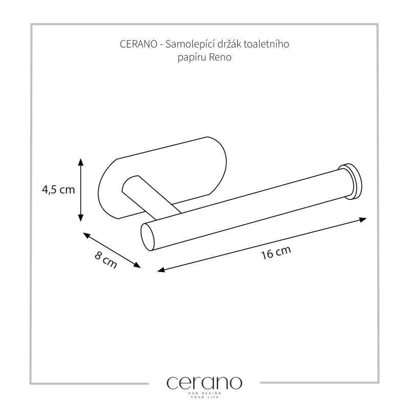 Držiak toaletného papiera značky Cerano zo série Reno je vyrobený z nerezovej ocele , vďaka čomu disponuje vysokou odolnosťou voči vlhkosti a korozívnym účinkom. Jeho dizajn je jednoduchý, ale elegantný. V našej ponuke je k dispozícii v čiernej matnej farbe alebo chrómovom variante.
