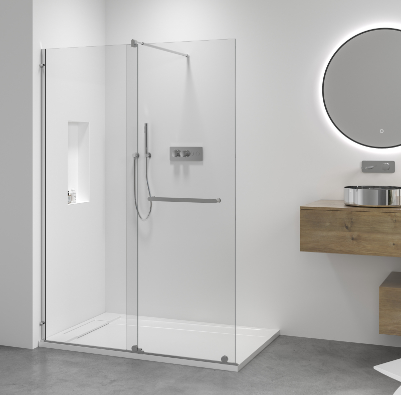 Cerano MEDIN je dvojdielna sprchová zástena typu walk-in , ktorá spája moderný dizajn, bezbariérové prevedenie a inteligentné využitie priestoru . Kombinácia pevného skla a posuvného dielu umožňuje pohodlný vstup bez nárokov na ďalší priestor .
