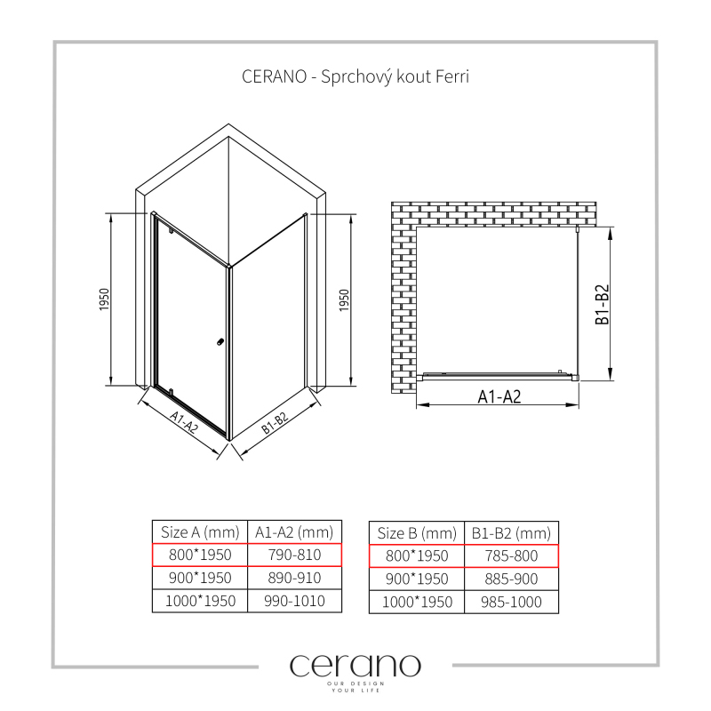 V rámci tejto série ponúkame širokú škálu rozmerov, aby sme uspokojili rôzne potreby našich zákazníkov. Všetky sprchové kúty, dvere a zásteny značky CERANO sú plne kompatibilné so sprchovými vaničkami CERANO v rovnakých rozmeroch, čo zaisťuje bezproblémovú inštaláciu a dokonalé zladenie. Sprchovací kút je možné navyše inštalovať flexibilne – buď na zodpovedajúcu sprchovú vaničku, alebo priamo na podlahu podľa vašich preferencií a možností kúpeľne.