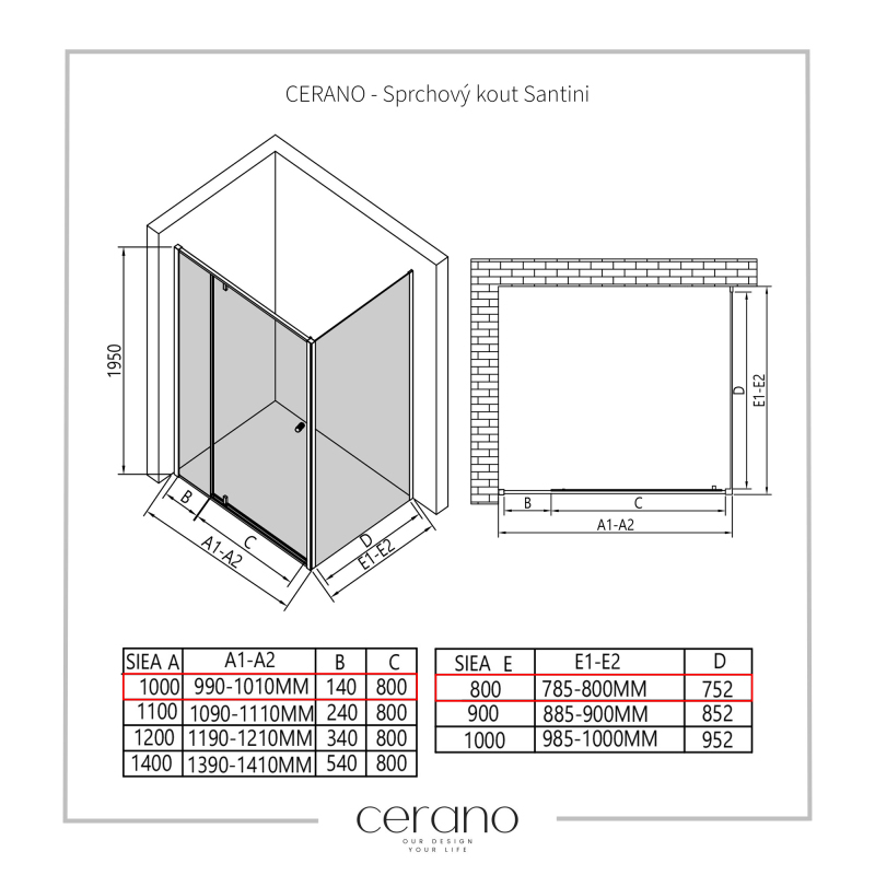 V rámci tejto série ponúkame širokú škálu rozmerov, aby sme uspokojili rôzne potreby našich zákazníkov. Všetky sprchové kúty, dvere a zásteny značky CERANO sú plne kompatibilné so sprchovými vaničkami CERANO v rovnakých rozmeroch, čo zaisťuje bezproblémovú inštaláciu a dokonalé zladenie. Sprchovací kút je možné navyše inštalovať flexibilne – buď na zodpovedajúcu sprchovú vaničku, alebo priamo na podlahu podľa vašich preferencií a možností kúpeľne.