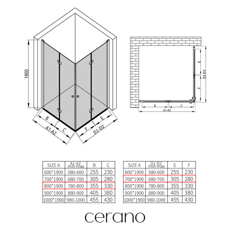 V rámci tejto série ponúkame širokú škálu rozmerov, aby sme uspokojili rôzne potreby našich zákazníkov. Všetky sprchové kúty, dvere a zásteny značky Cerano sú plne kompatibilné so sprchovými vaničkami Cerano v rovnakých rozmeroch, čo zaisťuje bezproblémovú inštaláciu a dokonalé zladenie. Sprchovací kút je možné navyše inštalovať flexibilne – buď na zodpovedajúcu sprchovú vaničku, alebo priamo na podlahu podľa vašich preferencií a možností kúpeľne.