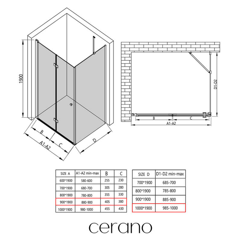 V rámci tejto série ponúkame širokú škálu rozmerov, aby sme uspokojili rôzne potreby našich zákazníkov. Všetky sprchové kúty, dvere a zásteny značky Cerano sú plne kompatibilné so sprchovými vaničkami Cerano v rovnakých rozmeroch, čo zaisťuje bezproblémovú inštaláciu a dokonalé zladenie. Sprchovací kút je možné navyše inštalovať flexibilne – buď na zodpovedajúcu sprchovú vaničku, alebo priamo na podlahu podľa vašich preferencií a možností kúpeľne.