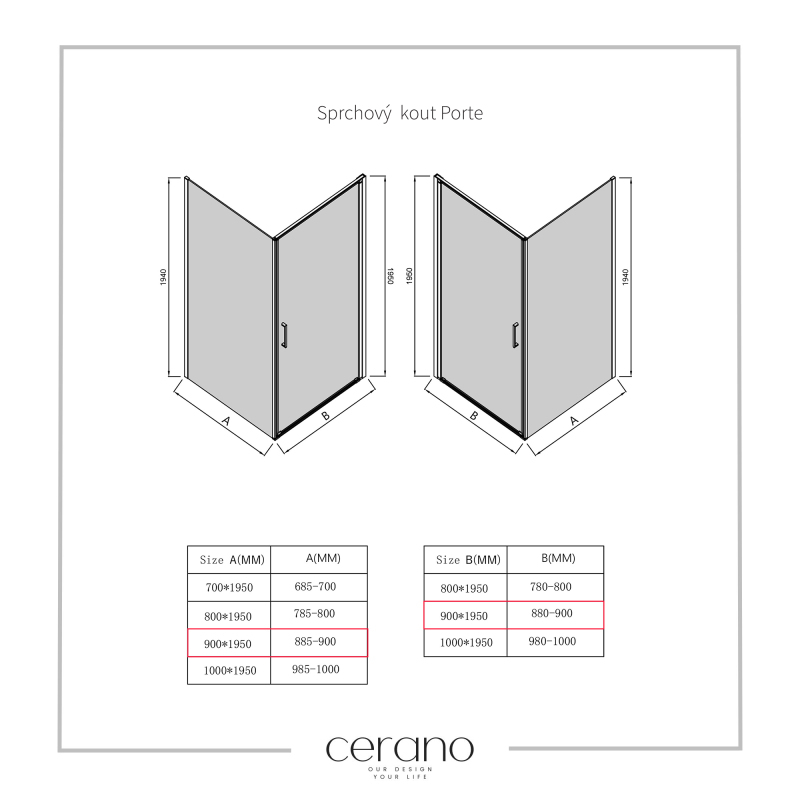 V rámci tejto série ponúkame širokú škálu rozmerov, aby sme uspokojili rôzne potreby našich zákazníkov. Všetky sprchové kúty, dvere a zásteny značky CERANO sú plne kompatibilné so sprchovými vaničkami CERANO v rovnakých rozmeroch, čo zaisťuje bezproblémovú inštaláciu a dokonalé zladenie. Sprchovací kút je možné navyše inštalovať flexibilne – buď na zodpovedajúcu sprchovú vaničku, alebo priamo na podlahu podľa vašich preferencií a možností kúpeľne.