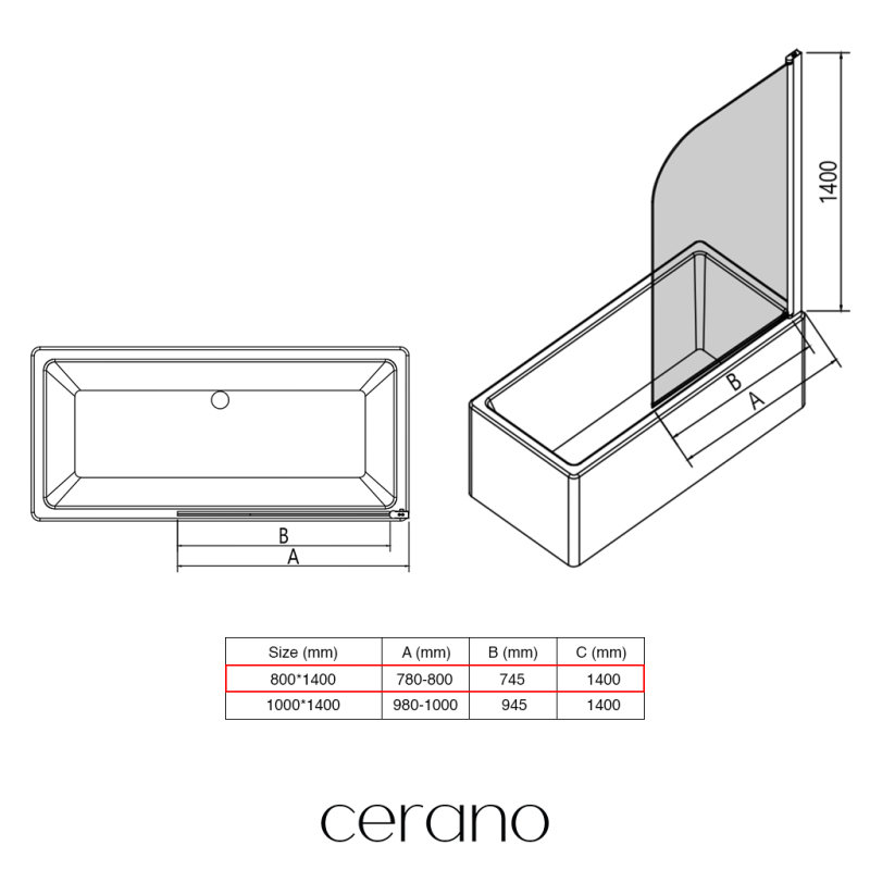 CERANO - Vaňová zástena jednodielna Chiara L/P - čierna / transparentné sklo - 80x140 cm