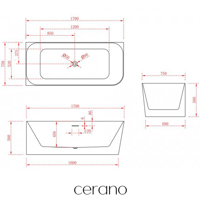CERANO - Voľne stojaca akrylátová vaňa Brilante, pravá - biela lesklá - 170x75 cm