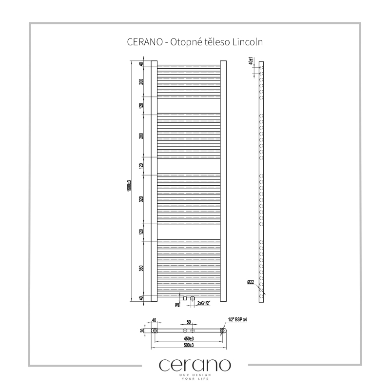 Štandardné pripojenie radiátora je 1/2", čo zaisťuje kompatibilitu s ventilmi a prípojnými sadami Cerano, aj od iných výrobcov. Uistite sa, že všetky súčasti zodpovedajú tomuto priemeru, aby bola zaistená bezpečná a efektívna prevádzka.