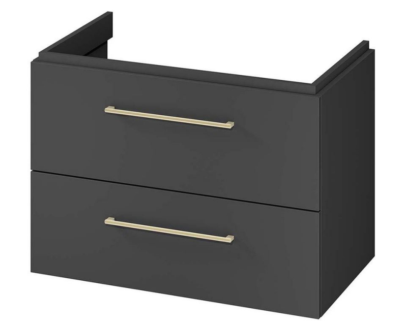 Skrinka pod umývadlo v antracitovej farbe z kolekcie Larga, veľkosť 80. Predná časť a korpus sú vyrobené z drevotriesky, povrchovo upravené elegantným antracitovým lakom. Skrinka je vybavená dvoma priestrannými zásuvkami, ktoré ponúkajú dostatok priestoru na uloženie kozmetiky, uterákov a kúpeľňových doplnkov. Ich interiéry sú vyvedené v elegantnej šedej farbe, ktorá ladí s antracitovou prednou stranou a vytvára tak esteticky súdržný celok. Systém soft-close zaisťuje jemné a tiché dovieranie zásuviek, čo zvyšuje pohodlie. Výrazným prvkom skrine je frézované madlo, ktoré podčiarkuje jej minimalistický štýl. Táto rukoväť je k dispozícii v troch farbách – striebornej, zlatej a čiernej – čo vám umožní personalizovať jednotku a zladiť ju s ostatným vybavením kúpeľne. Rukoväť je nutné zakúpiť samostatne. Doska, z ktorej je skriňa vyrobená, má certifikáciu FSC MIX CREDIT SGSCH-COC-007574.