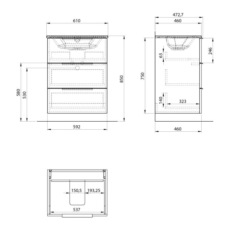 CIRASA umývadlová skrinka 59,2x75x46cm, 3x zásuvka, biela lesk CR631-3030