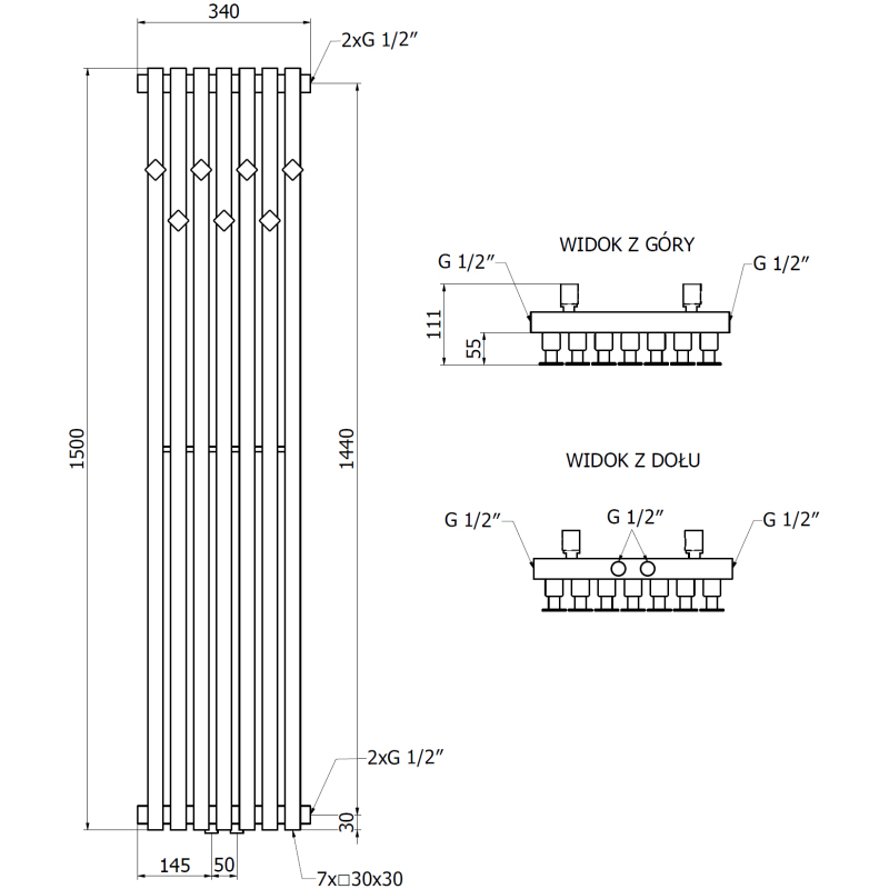 Technické údaje: Výška: 1500 mm Šírka: 340 mm Hĺbka: 102 mm Rozstup pripojenia: - 144 cm (bočne) alebo 5 cm (uprostred) Farba: Čierna RAL 9005 Materiál: Oceľ Hmotnosť: 13,16 kg Reakcia na oheň: A1 Prevádzková teplota: 1 Prevádzková teplota: 1 prevádzková teplota: 1 Vykurovací výkon: - 75/65/20 °C - 630 W Pripojenie: - 2xG ½″ uprostred - 4xG ½″ zhora a zdola na pravej alebo ľavej strane Počet háčikov na uteráky: 7 Vysoko kvalitný, odolný náter odolný proti korózii Sada obsahuje: závesy, montážnu sadu, zás