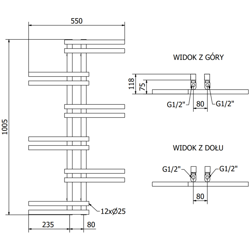 Technické údaje: Výška: 1005 mm Šírka: 550 mm Hĺbka: 75 mm Rozstup pripojenia: 8 cm Farba: Biela RAL 9016 Materiál: Oceľ Hmotnosť: 6,56 kg Reakcia na oheň: A1 Prevádzková teplota: max. 95 °C Maximálny prevádzkový tlak: 0,0 - 339 W Pripojenie: - 4xG ½″ uprostred Možnosť inštalácie výhrevného telesa Vysoko kvalitný, odolný náter odolný proti korózii Sada obsahuje: závesy, montážnu sadu, záslepky a odvzdušňovací otvor
