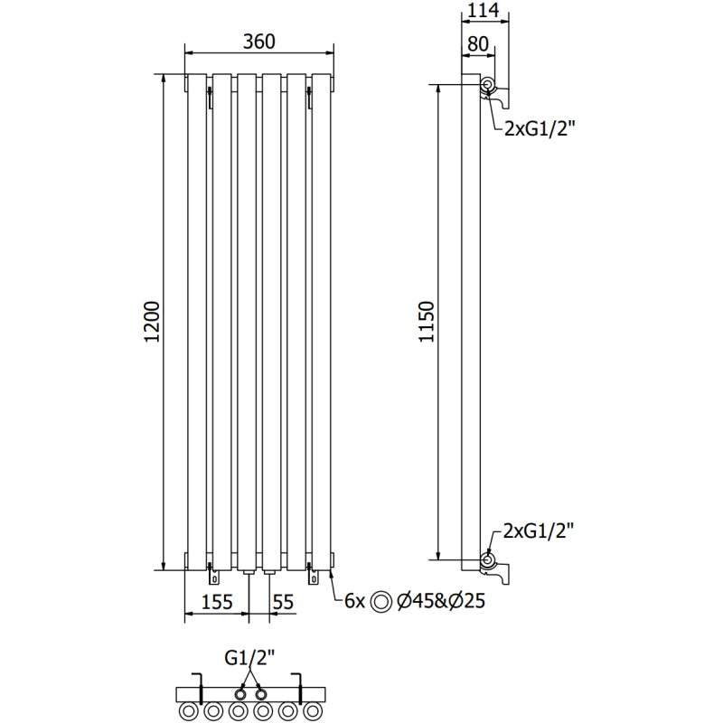 Technické údaje: Výška: 1200 mm Šírka: 360 mm Hĺbka: 78 mm Rozstup pripojenia: - 115 cm (bočne) alebo 5 cm (uprostred) Farba: Čierna RAL 9005 Materiál: Oceľ Hmotnosť: 14,42 kg Reakcia na oheň: A0 Prevádzková teplota: 0 Prevádzková teplota: 1 Vykurovací výkon: - 75/65/20 °C - 483 W Pripojenie: - 2xG ½″ uprostred - 4xG ½″ zhora a zdola na pravej alebo ľavej strane Vysoko kvalitný, odolný náter odolný proti korózii Sada obsahuje: závesy, montážnu sadu, záslepky a odvzdušňovací otvor
