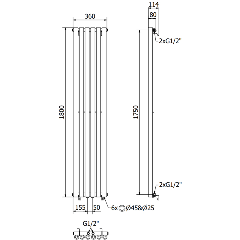 Technické údaje: Výška: 1800 mm Šírka: 360 mm Hĺbka: 78 mm Rozstup pripojenia: - 175 cm (bočne) alebo 5 cm (uprostred) Farba: Čierna RAL 9005 Materiál: Oceľ Hmotnosť: 20,83 kg Reakcia na oheň: A1 Prevádzková teplota: 1 Prevádzková teplota: 1 Vykurovací výkon: - 75/65/20 °C - 705 W Pripojenie: - 2xG ½″ uprostred - 4xG ½″ zhora a zdola na pravej alebo ľavej strane Vysoko kvalitný, odolný náter odolný proti korózii Sada obsahuje: závesy, montážnu sadu, záslepky a odvzdušňovací otvor
